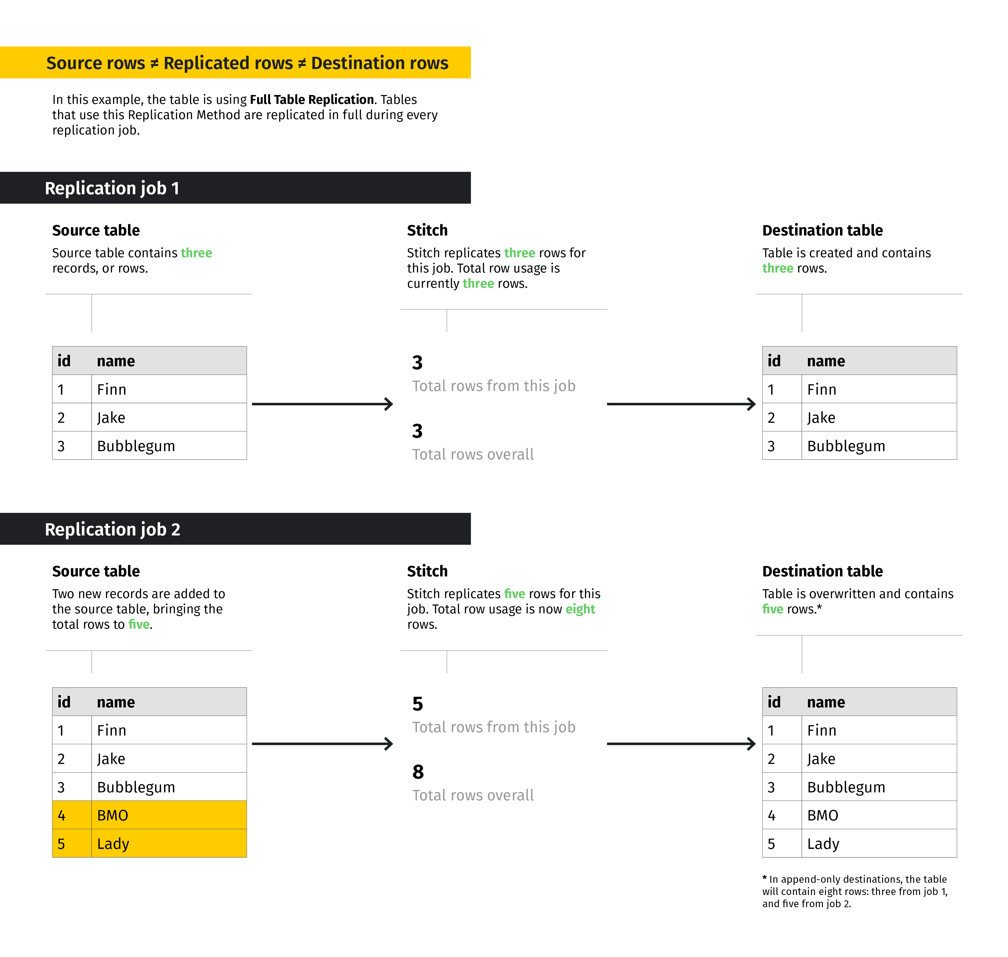 When looking at the examples, note the differences between the source rows and row totals reported in Stitch.