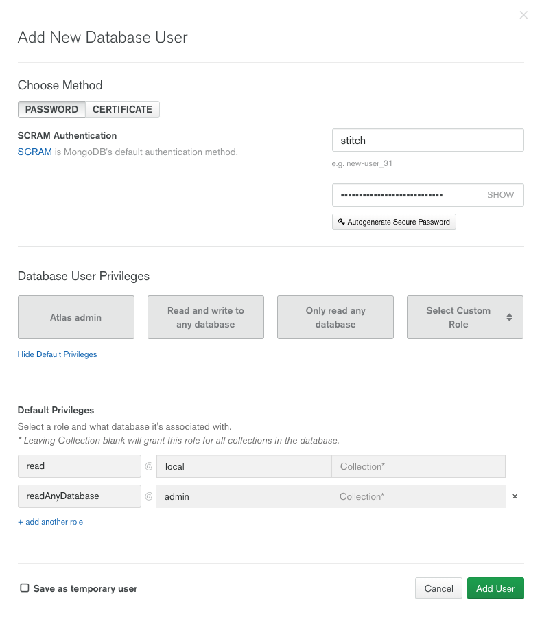 stitch. - Password: Enter a secure password for the Stitch user.